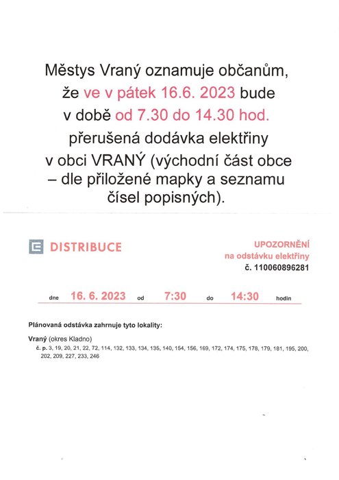 Úvod > Městys Vraný > Aktuality > Přerušení dodávky elektřiny