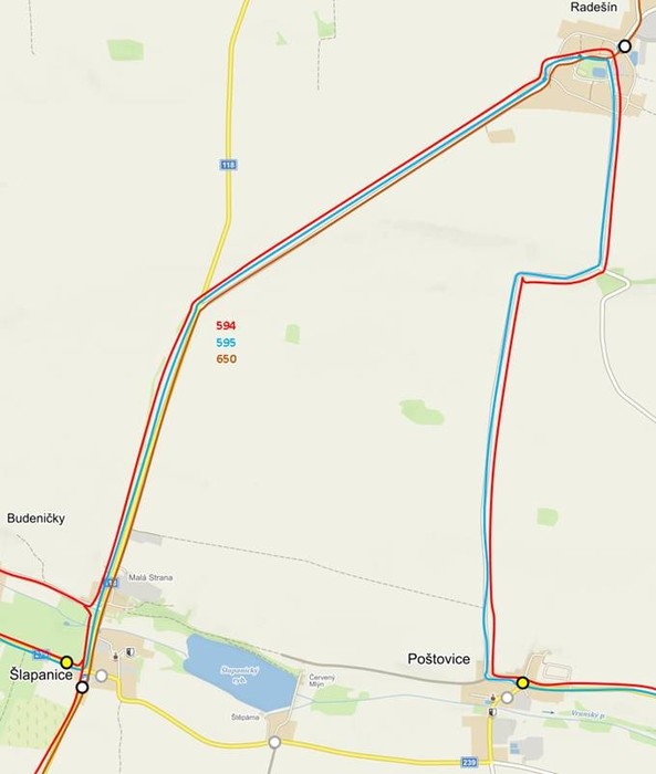 - Linka 650 bude z důvodu potřeby zachovat přípojné vazby v Litoměřicích i Slaném vedena z Radešína přímo na zastávku Šlapanice, křižovatka. Pro cesty z Poštovic do Slaného je možné využít linku 594.