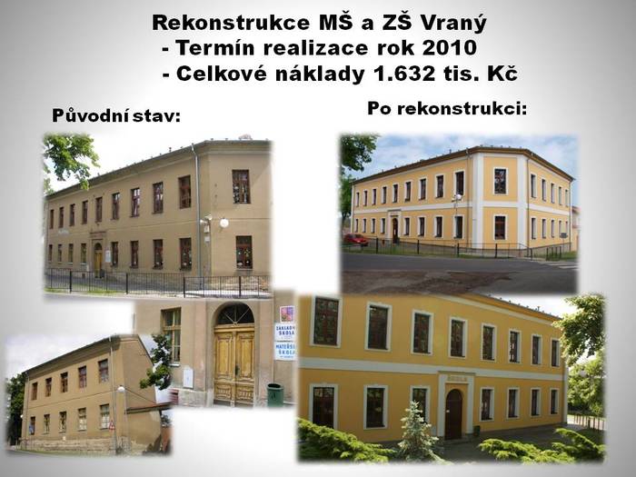 Rozsáhlé modernizační úpravy školy byly provedeny hlavně po r. 1945 (obrázek z té doby) a průběžně se pokračuje ve zvelebování a doplňování školy (vyučuje se 1 – 5 ročník) i přilehlé mateřské školky dodnes. Zásluhou úsilí a obětavosti generací občanů, učitelů a péčí činitelů obce a státních orgánů je, že máme ve Vraném školu a školku pěknou, čistou, dobře vybavenou a fungující. Městečko je právem hrdé na dobrou tradici, vždyť za dobu jejího trvání zde působilo mnoho schopných učitelů a základní vědomosti zde získalo tisíce dětí a mezi nimi vynikající osobnosti jako sourozenci Čechovi, Věšínovi, Štrayblovi a mnozí inženýři, doktoři, učitelé a odborníci, kteří se pak v životě dobře uplatnili. Věřme, že její existence nebude z důsledku nedostatku dětí nebo zhoršené ekonomické situace přerušena nebo dokonce ukončena.