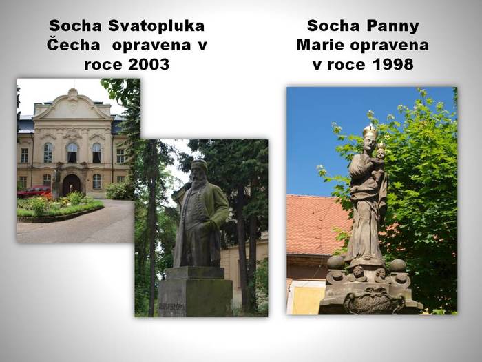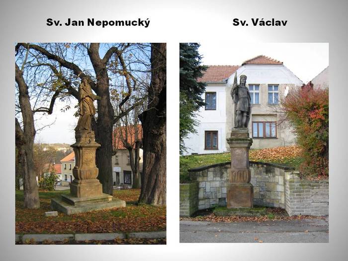 Mezi památky patří i další tři sochy - Sv. Jana Nepomuckého, která je nejvzácnější a je popisována již v roce 1727. Stojí na náměstí ve stínu kaštanů. Na prostanství před farou stojí socha Panny Marie, dobrá ukázka barokní skulpturální práce. Před touto sochou byl zřízen vkusný parčík. Poblíž radnice je umístěna nejmladší socha Sv. Václava.