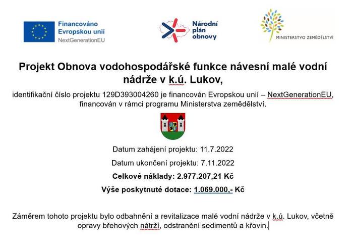 Projekt Obnova vodohospodářské funkce návesní malé vodní nádrže v k.ú. Lukov,